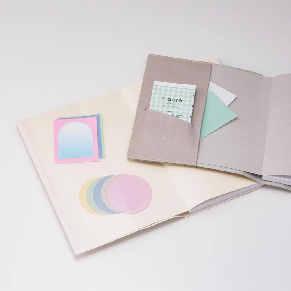 こちらの「水彩モチーフ柄」は、幾何学的な形やテープを重ね貼りしたかのような遊び心を感じさせるデザイン。水彩ならではのやわらかく淡いタッチで、ページの余白も書き手の心も温かく包んでくれそうです。