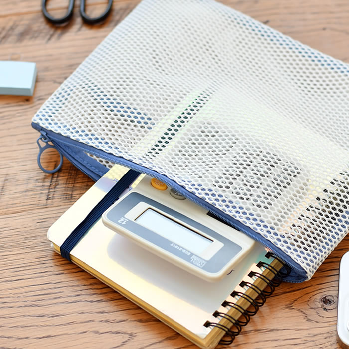 目の粗いメッシュ素材が軽やかな印象を与えるフラットポーチ。A5サイズに対応しているので、手帳やノートを収納して持ち運ぶのに便利です。ペンやシールなど細々した文具は内側のポケットに。これなら「カバンの中でどこにいったかわからなくなった」なんて慌てずにすみますよ。