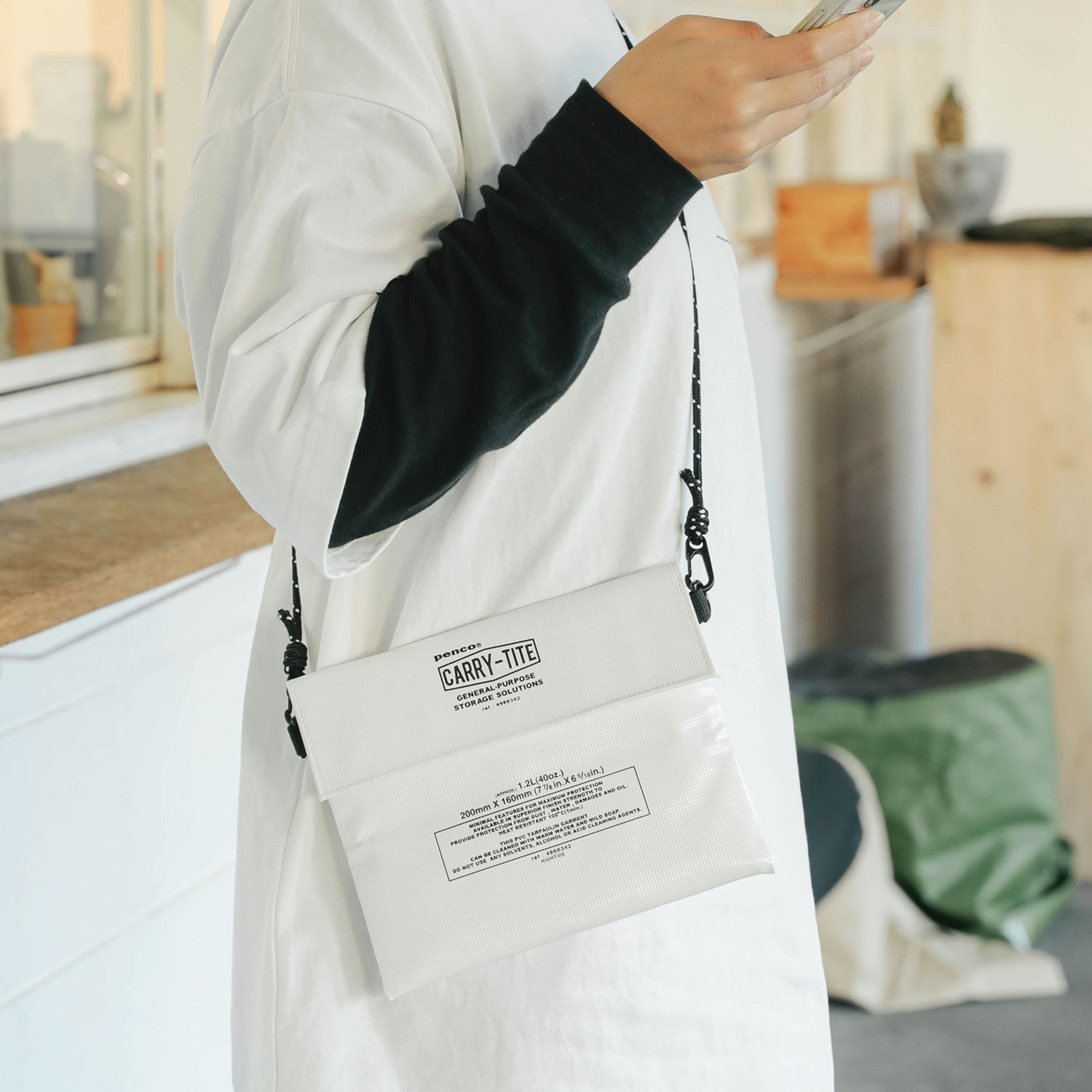 サコッシュにしたケースの色違いを恋人とお揃いで持って、近くの散歩など、ちょっとしたデートにでかけるのもおすすめ。丈夫なターポリン生地を使っているため水濡れや汚れを気にせずヘビーユーズできますよ。