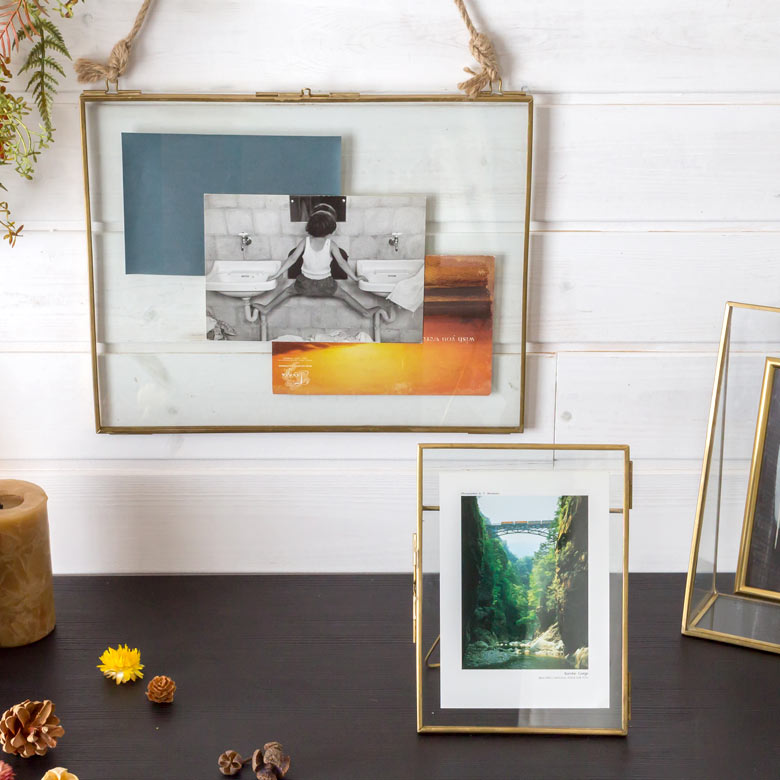 独特な深みのある真鍮素材のフレームとガラスでできた、こちらのハンギングタイプのフォトフレームは、落ち着いた存在感があります。経年変化を楽しめる真鍮素材は、使っていくうちに風合いが生まれるところが趣深く、時の流れと共にアンティークさが増すアイテム。