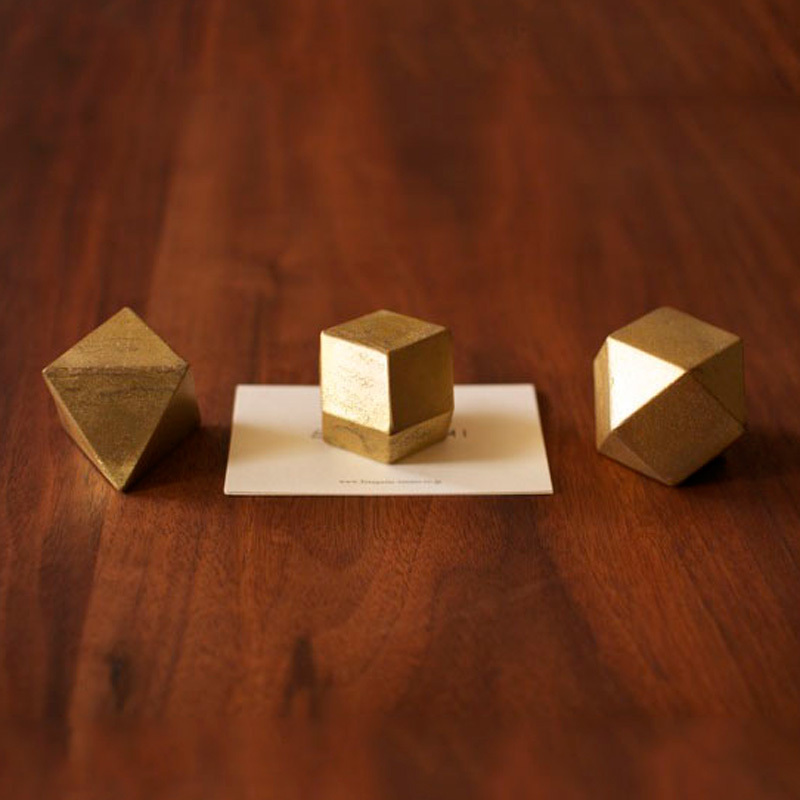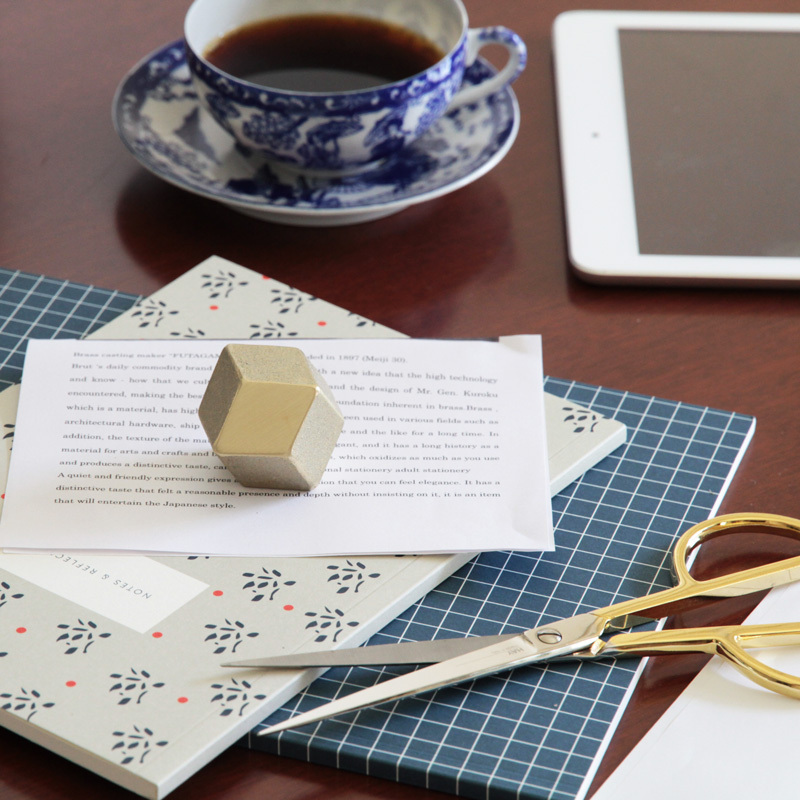 こちらはそんなFUTAGAMIが手掛けるペーパーウェイト「菱形」。シンプルで洗練された雰囲気を放つアートのような存在感があります。クルミ大で手にすっぽり収まるサイズでも、真鍮ならではの重みで紙類をきちんと押さえてくれます。ゴールドの輝きと立体的な造形が、心に不思議な落ち着きを与えてくれますよ。