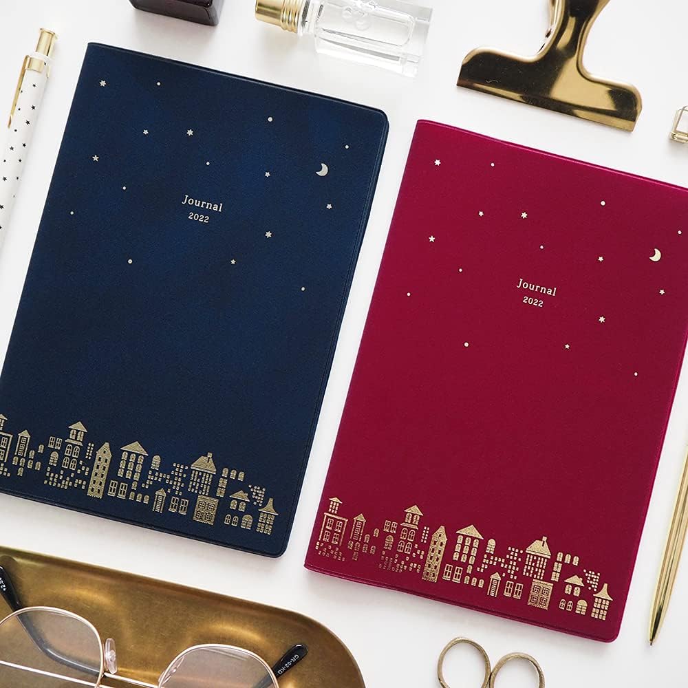 触り心地の良いスエード調の生地に、月や星、街が金箔でキラキラと輝いてます。そのロマンチックなデザインに、思わず願いをしたためたくなります。中を開けば、背景色や飾り枠、書体が毎月変わる飽きの来ないマンスリーページ。表紙だけじゃない、書き込む時間を充実させてくれる工夫が備わっています。
