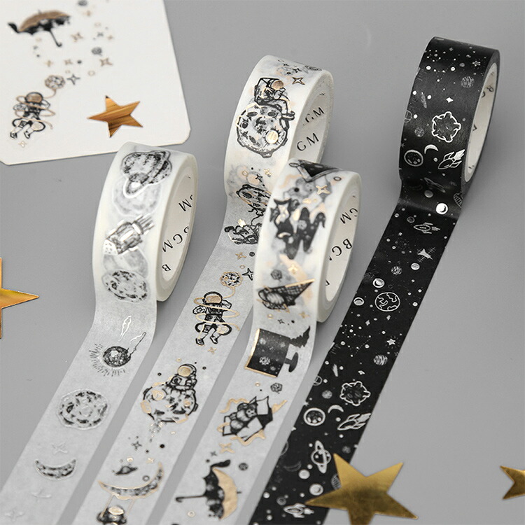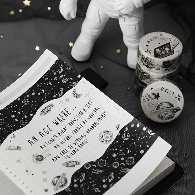 黒をベースに白や金銀で描かれた惑星やロケットが可愛らしく、手帳やノート、しおりのアクセントにもなりそう。他の色味を使わず、あえてモノトーンで統一することで、シンプルながらもグッとおしゃれに仕上がります。
