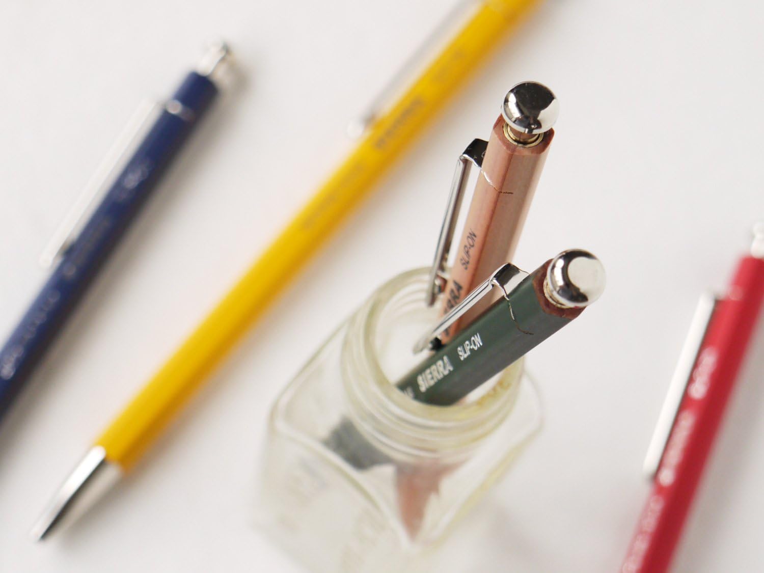 「SLIP-ON(スリップオン)」から、学生時代を思い出すような鉛筆仕様の木軸シャープペンが登場。シンプルなデザインだからこそ、SIERRA(シエラ)のロゴが目を引くアクセントになっています。