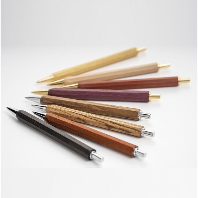 持ちやすい六角形の軸は、黒檀、ウォールナット、パープルハート、メープルの4種類。ペン先やクリップには黒檀が使われており、シックな印象に仕上がっていますよ。選ぶ木軸の素材によって、色味や風合いがそれぞれ変化していく経年変化も楽しめます。指先と視線を捉えて離さない使い心地を味わってみてくださいね。