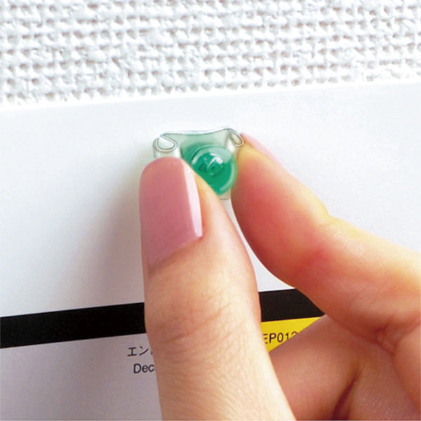 ここでご紹介するのは、指輪のようなおもしろいデザインの画鋲「プニョプニョピン」。樹脂でできたカバーがポイントで、直接針に触らず取り扱えるので、安全に抜き差しできます。落とした時も針が上を向かないのも安心。カバーをつまむことで、余計な力を入れず抜けるのも気の利いたポイントですね。