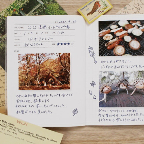 キャンプ場や日付、メンバーといった基本的な項目に加え、5つ星でキャンプを評価できるのが新鮮で楽しいアイデア。「思い出」欄は自由に広く使えるので、作った料理やみんなの笑顔など、キャンプで撮った写真もこの一冊にまとめられます。楽しかったことはもちろん、失敗してしまったことや次回チャレンジしたいことも書き込めば、次のキャンプがもっと楽しみになりそうですね。