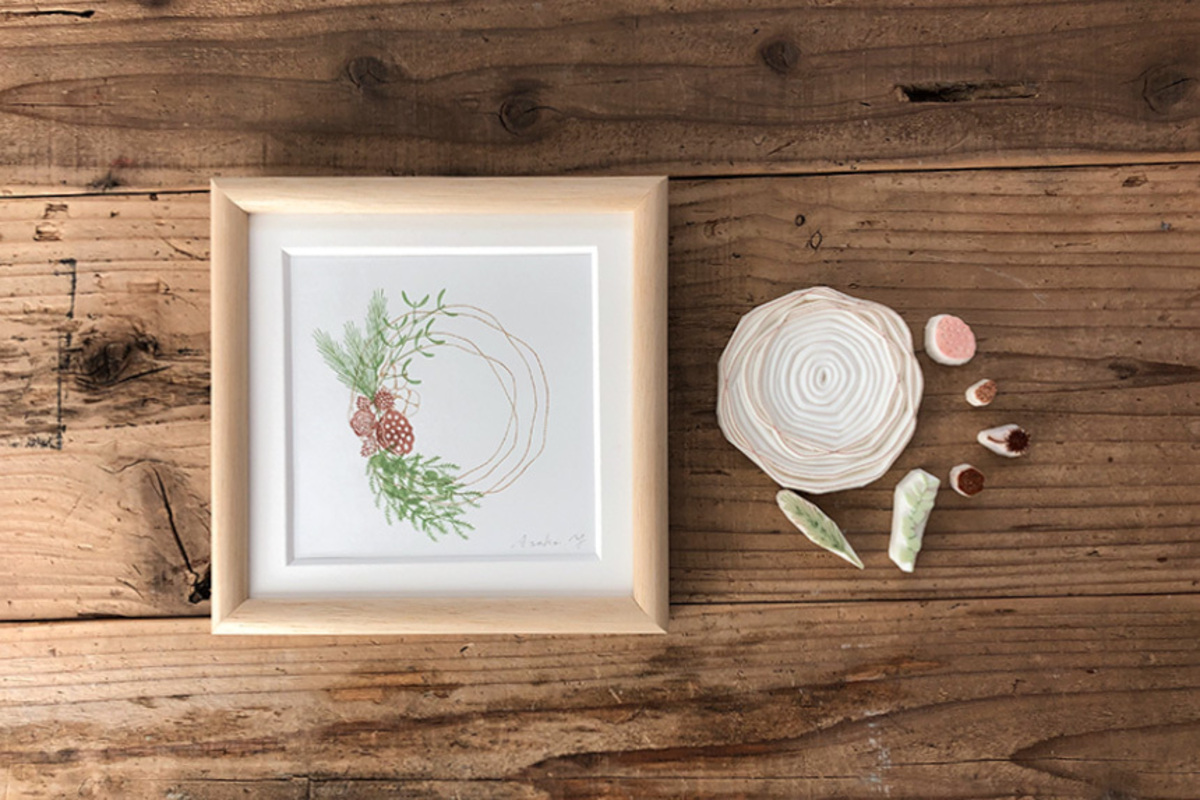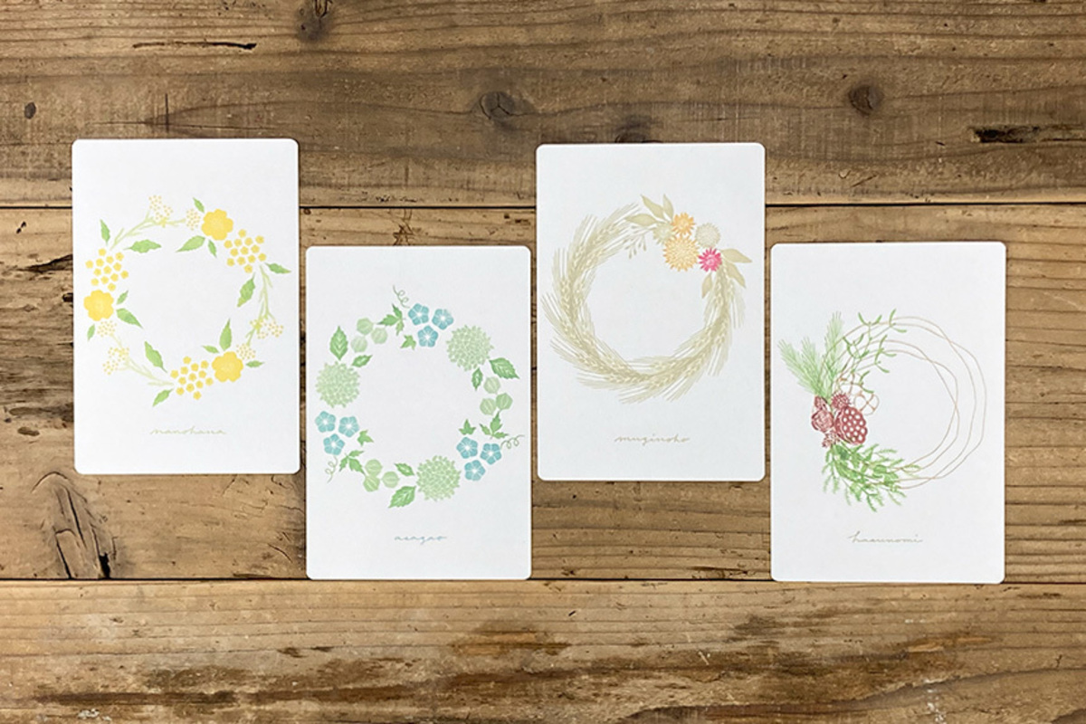 季節ごとの花をメインに据えたリースは、消しゴムはんこ作家の芳仲麻子さんによるデザイン。 春は菜の花の黄色が目を引き、夏の朝顔が爽やかさを感じさせます。繊細に描かれた麦の穂は、まるで実りの秋を呼び起こすかのよう。朱の鮮やかな蓮の実には、寒い冬を乗り越えるための温もりが宿っています。