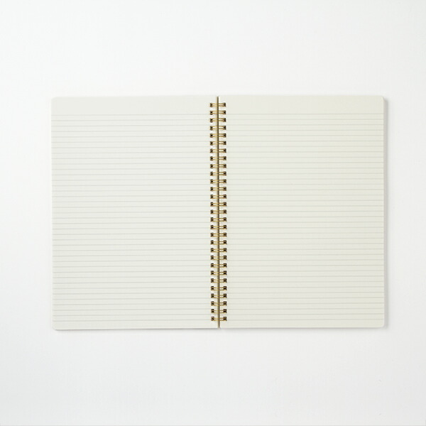 リング部分はゴールドで、上品な雰囲気があります。リングノートのメリットは、くるっとページを折り返して半分のサイズで使えるため、広いスペースが無い場合や、資料、参考書を広げていても邪魔にならないところが便利。