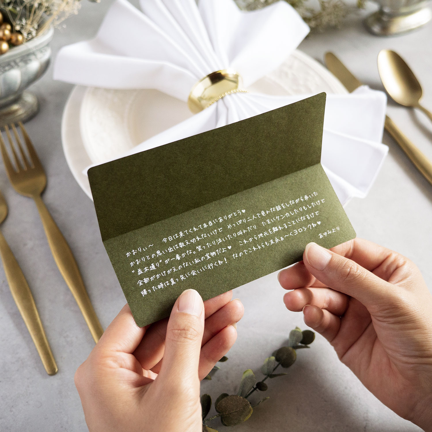 披露宴が始まる前のちょっとした時間に、ゲストが目を通す席札に綴られたメッセージ。限られた披露宴の時間では全てのゲストに感謝の気持ちを伝えきれないからこそ、大事な役割を果たすんです。また、披露宴へのワクワク感をより高め、会場が一体化する…なんてことも期待できます。