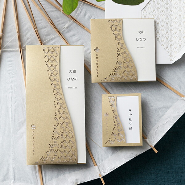 ゲストの名前が印字された純白のシートに黄金の小紋柄を被せるため、席札に奥行きが生まれ高級感がプラスされます。同シリーズの席次表や招待状も展開されているので、気になる方は併せてチェックしてみてください。