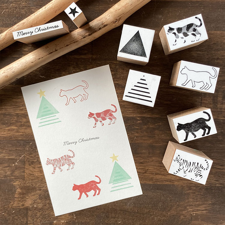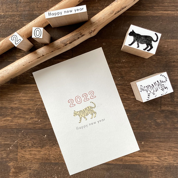 猫の絵柄は、トラ、ミケ、クロ、シロの4種類。寅年にはこんな年賀状のデザインも楽しめます。インクの色を変えたり、上から色を塗ったり、アイデア次第で違った印象を楽しめるのがスタンプの魅力。思いつくまま、いろいろなアレンジを試してみてくださいね。イラストを描くのが苦手な方でも、気軽に猫モチーフをプラスできる便利なアイテムです。
