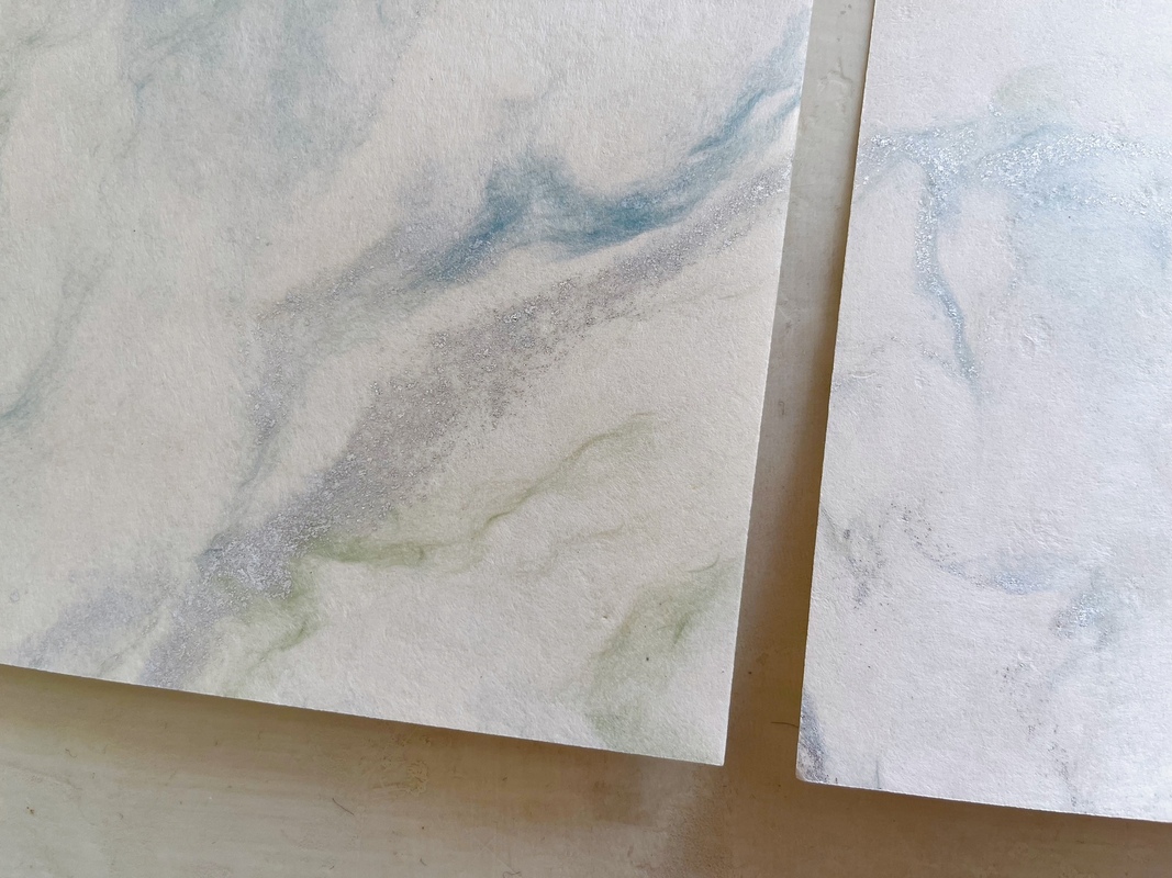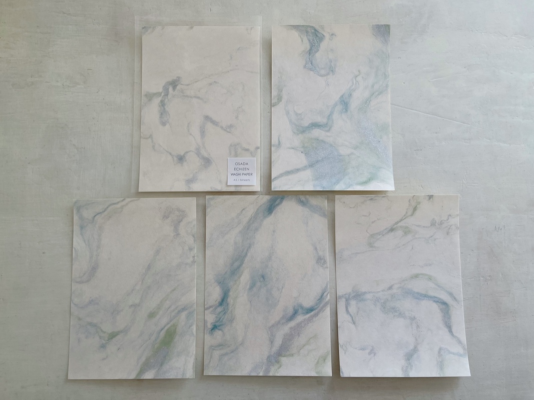 ブルーグリーン&シルバーの色合いは、柔らかな和紙が凛として見えて「なんてカッコイイんだ…!」と射貫かれました。色が流れているような、有機的で自然な模様が他になく魅力的なんです。やや厚手で1枚でもしっかりしているので、別で用意した便箋に手紙を書いて、封筒代わりに包んでみたい。