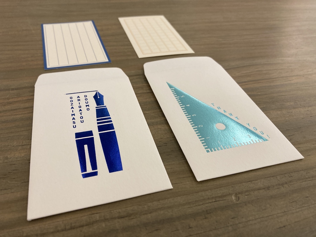 万年筆の柄は「どうもありがとうございます」がローマ字で縦書きになっているところがお気に入りです。ミニカードも原稿用紙タイプやシンプルな罫線タイプなど組み合わせを考えるのもとても楽しかったです。