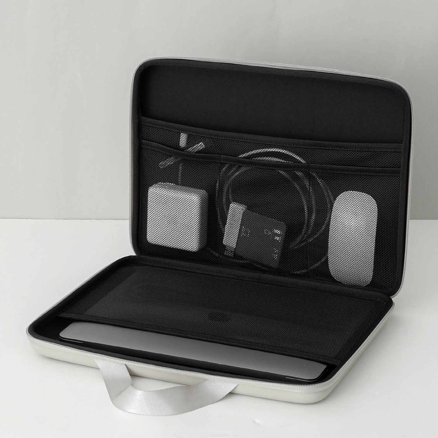 内側には、周辺機器などを収納できるメッシュ素材のポケットがついていますよ。持ち運びに便利なハンドル部分は、光沢があるリボン仕立てになっており上品な印象です。中身をしっかり守りながら、見た目も引き立ててくれるPCケースです。
