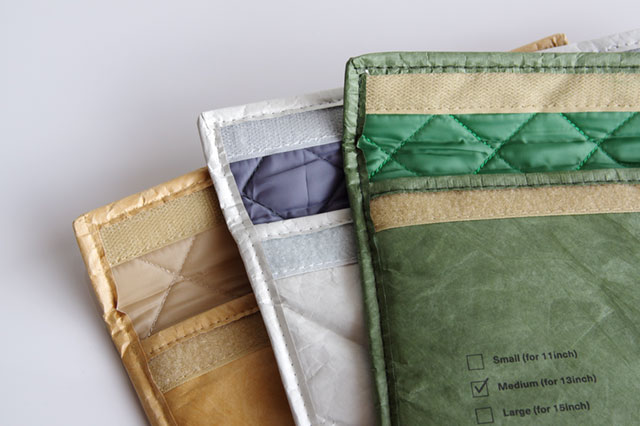 外側に使用しているのは紙のようにも見えますが、実は水や衝撃に強いタイベックという素材。使い込むほどにシワが生じるので、より雰囲気が増していきますよ。内側はクッション性のあるキルティング素材になっているので、安心してノートパソコンを持ち歩けます。