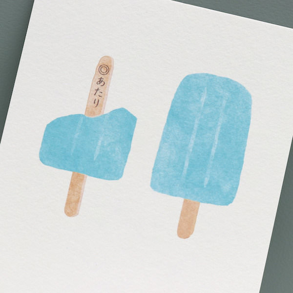 こちらは、越前和紙で作られたアイスキャンディーのポストカードです。水彩画のような優しいタッチで描かれたアイスキャンディーは、きっとソーダ味。しゃりっとした触感とキーンとくる冷たさのアイスキャンディーが頭に浮かびます。
