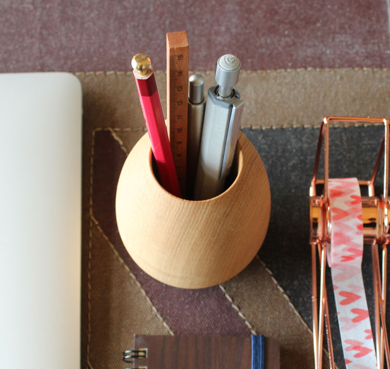 素材は無垢の木材で、使い込むほどに風合いが増します。経年変化で全体の色合いが落ち着いてくるので、長く愛用するのが楽しい文具です。美しいフォルムを活かせるよう、ペンポットに差し込むペンたちも厳選したくなりますね。