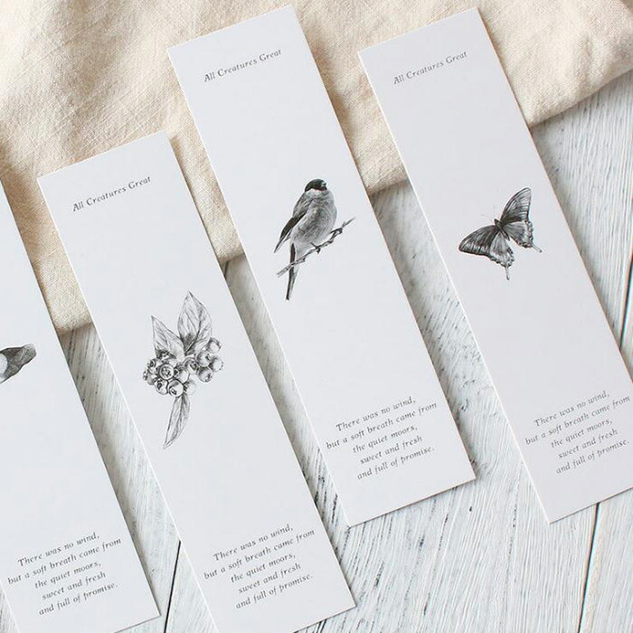 こちらは、動物や植物のワンポイントデザインがかわいい栞です。サイズは15㎝×4㎝と、文庫本だと少しはみ出るようなサイズ感。栞上部の英字をのぞかせて使うのもおしゃれですね。栞の選び方がわからないときには、こういったサイズ感も意識するのがおすすめですよ。