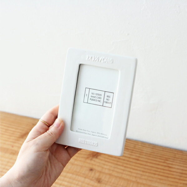 こちらは、スタンドタイプの磁器製フォトフレーム。丸みのあるシルエットが優しい雰囲気を演出し、インテリアに自然と溶け込みます。フォトフレームに飾った写真やポストカードをおしゃれに演出してくれる、ぷっくりとしたエンボス調のロゴもポイントです。
