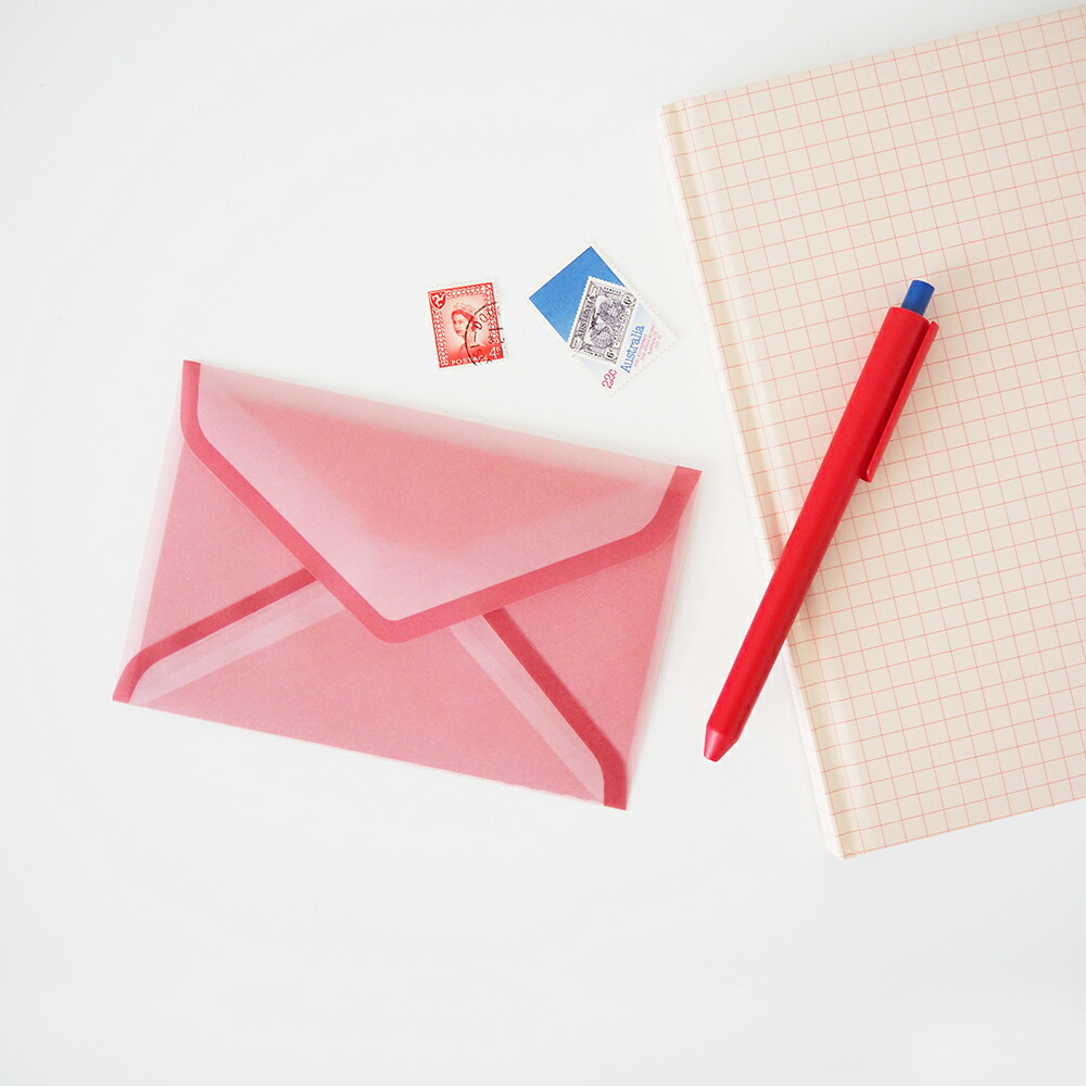 便箋はビビットカラーなので、封筒から色が優しく透けてみえるのもかわいいポイントの1つ。便箋の裏にスタンプを押したり、シールを貼ったりしてみても素敵な仕上がりになりそうですね。自分でアレンジも加えられるというのが、シンプルデザインならではのいいところ。