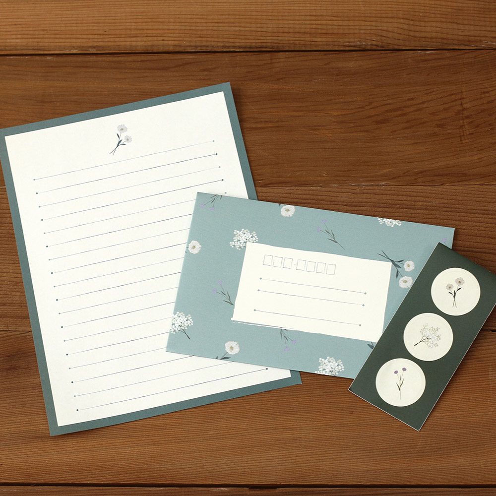 便箋には色鉛筆タッチの繊細な小花が1つだけシンプルに描かれています。その繊細な小花に合わせた、差し色のカラーがおしゃれ。レターセットのカラーは3種類あるので、お好みに合わせてチョイスできますよ。どれも上品な色合いで、結婚式の友人代表スピーチにもおすすめです。