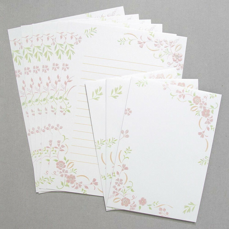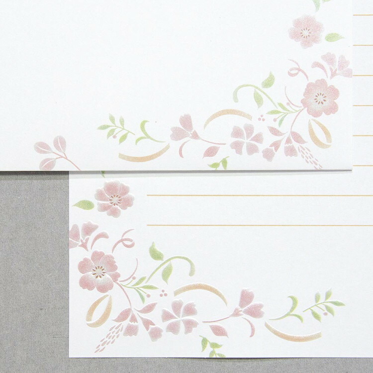 最初にご紹介するのは「エヌビー社」のレターセットです。白を基調とした封筒と便箋にピンクの花が散りばめられたデザインは、まさに花嫁の手紙のイメージ通り。
