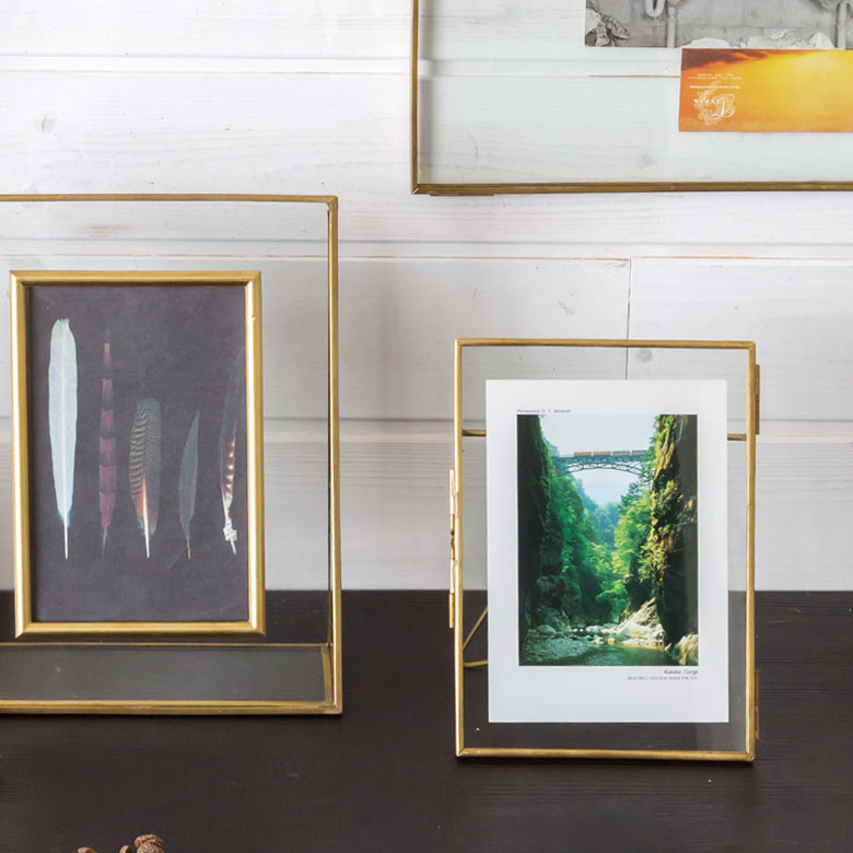 こちらは2枚のガラスをハタガネと呼ばれる真鍮製のパーツで止めあわせる、スタイリッシュなフォトフレームです。額縁をなくし、飾るものを目立たせるのには最適なデザインとなっていますよ。