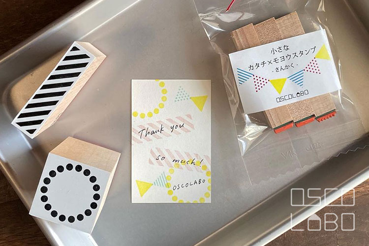 こちらは、小さい三角形とハート型のスタンプです。シンプルにそのまま押してもかわいいですが、三角形を並べてガーランドやツリーを作ったり、ハートを丸く並べてクローバーにしたり…とアレンジ方法はさまざま。