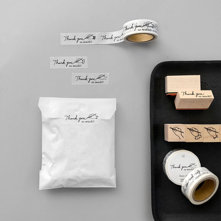 こちらの方は、クラフト紙でできた紙袋に梱包したいものをそのまま入れ、リボンとオリジナルのタグでラッピングしています。シンプルなラッピングですが、それによってカラフルに描かれた「Thank you」という文字がより映えていますね。