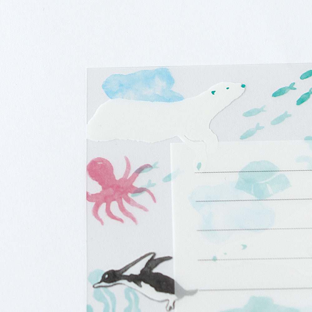 クリア素材の便箋をゆったりと泳ぐシロクマやペンギンのイラストに、心がほっこり癒されます。このレターセットなら、受け取った相手が暑い夏を楽しく乗り越えられるのではないでしょうか。