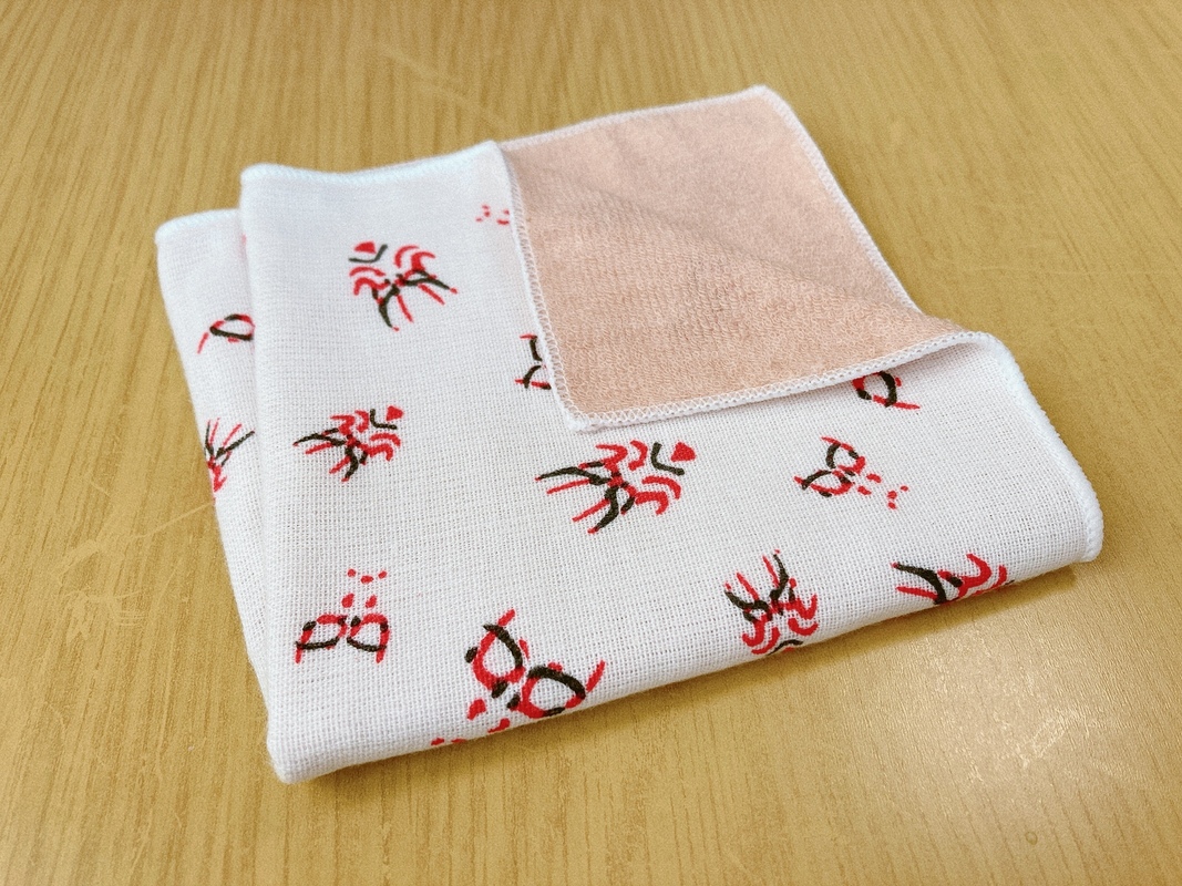 お土産の中でも人気が高いという隈取がデザインされた和たおる。様々な赤い隈取がデザインされているところがお気に入り。裏のベージュの色とのバランスもとても素敵です。