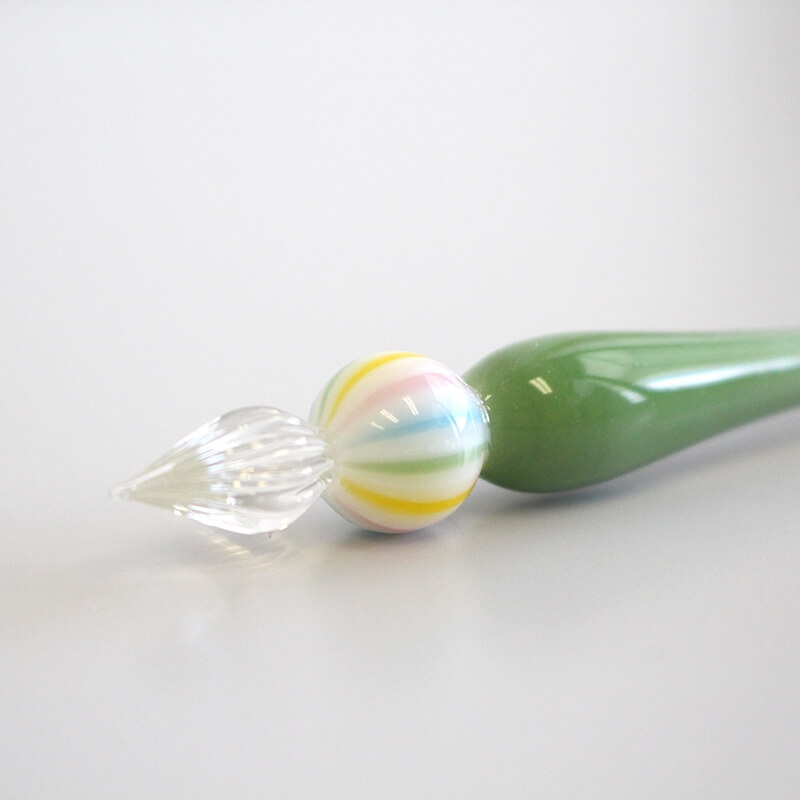 こちらは「和スイーツ 抹茶」という美味しそうな名前の国産ガラスペン。ガラス工芸品を手がける「ぐり工房」が、一つひとつ手作業で制作しています。軸の両端に付いた飴玉のような飾りが愛らしく、文具女子の心をくすぐりますね。