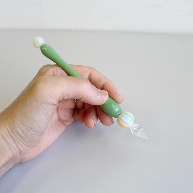 このガラスペンは軸が太くて短めの、ぽってりとしたフォルムが特徴的。「触れたら壊れてしまいそう...」と使うのをためらうことなく、手に取りやすいガラスペンを目指した結果、この形に行き着いたのだそう。普段使っているペンと同じ感覚で持てるのはうれしいですね。