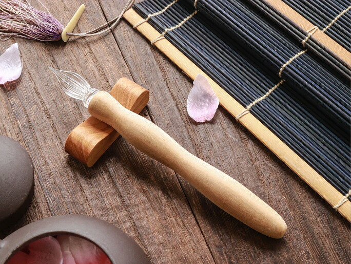 最後にご紹介するのは、使い勝手が良い分離型の国産ガラスペンです。制作したのは、ガラスペンと同じく1902年に誕生した文具メーカーの「呉竹」。ガラスペンの軸にもセットのペンレストにも、吉野山の貴重な天然桜が使われています。